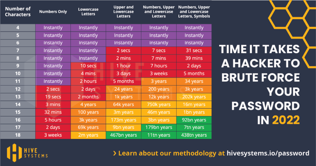 Describing the requirements for good passwords is one thing, but seeing a visual representation is better. Below is a color-coded chart made by Hive Systems that shows how long it takes a hacker to break a password (with current technology) based on their length and complexity. As you can see, short, simple passwords are similar to having no password at all, but as a user’s password gets longer and more complex, they become virtually impossible for a hacker to crack.